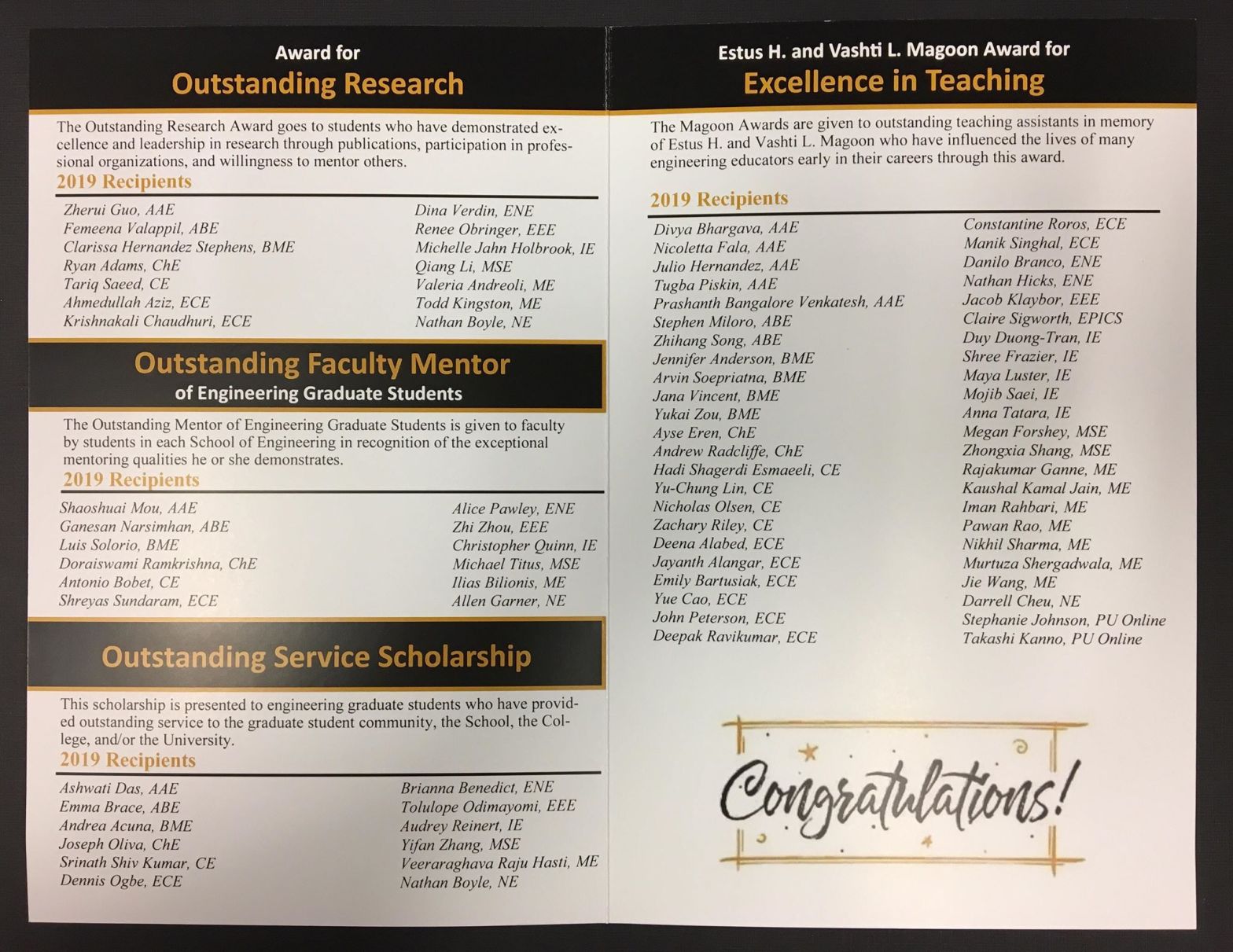 Each year, the College of Engineering at Purdue gives awards for Outstanding Service, Teaching, and Research to students in each of the engineering schools/departments at Purdue. Today, all these outstanding graduate students were recognized at a luncheon with department heads, mentors, and other supporters present.