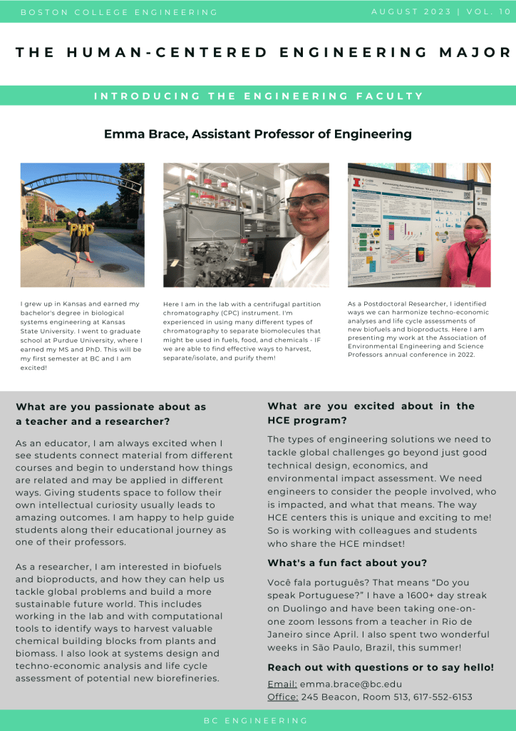 I am so excited for my first-semester as an Assistant Professor of Engineering at Boston College! This fall I will be teaching our Third-Year Reflection course, which is a required seminar for all third-year students where they will explore the relationships among engineering, design, and society. In particular, they will explore ideas of engineering identity, service-based engineering, and what it means to engage with communities during engineering project work. The third-years are the inaugural class in the Human-Centered Engineering major at BC, and I am looking forward to getting to know them through reflection this fall.